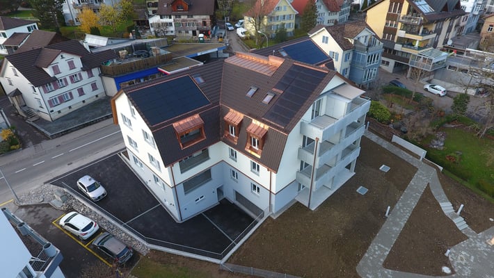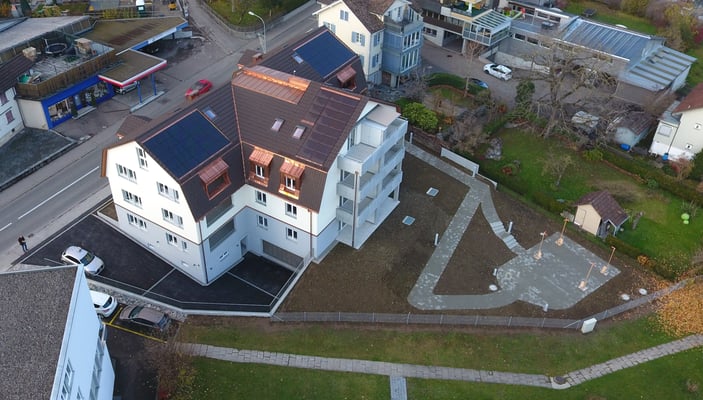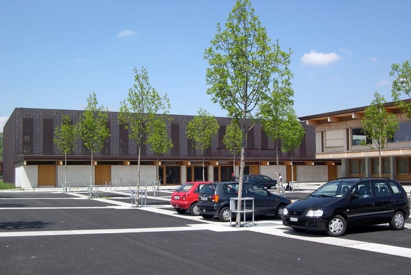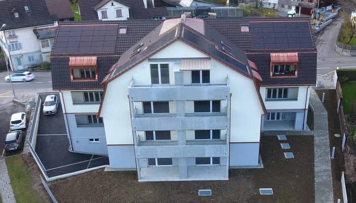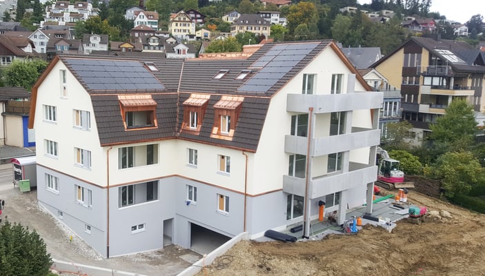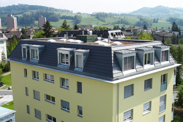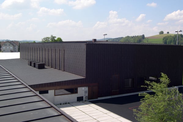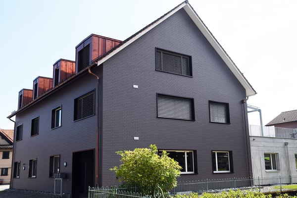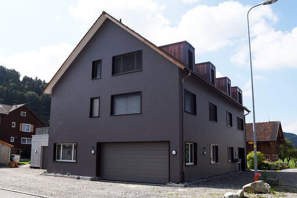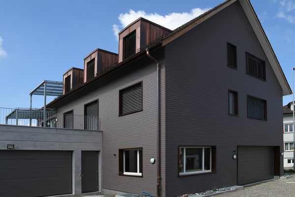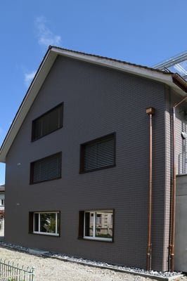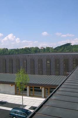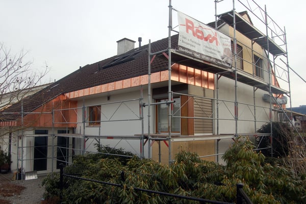 Gesamte Gebäudehülle: Fassade Eternit, Dach Falzbiberschwanz, Spenglerarbeiten Kupfer
